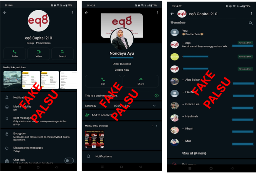 Kuala Lumpur, 19 July 2024 – It has been brought to our attention that there is a possible investment scam being offered by a group of third-party individuals. The third-party individuals, unrelated to Kenanga Investors Berhad (“Kenanga Investors”) and/or its subsidiaries (collectively, “Kenanga Investors Group”), have been using the name and logo of Eq8 Capital Sdn Bhd (“Eq8”), a subsidiary of Kenanga Investors to promote illegal or unlicensed investment schemes through the WhatsApp application.